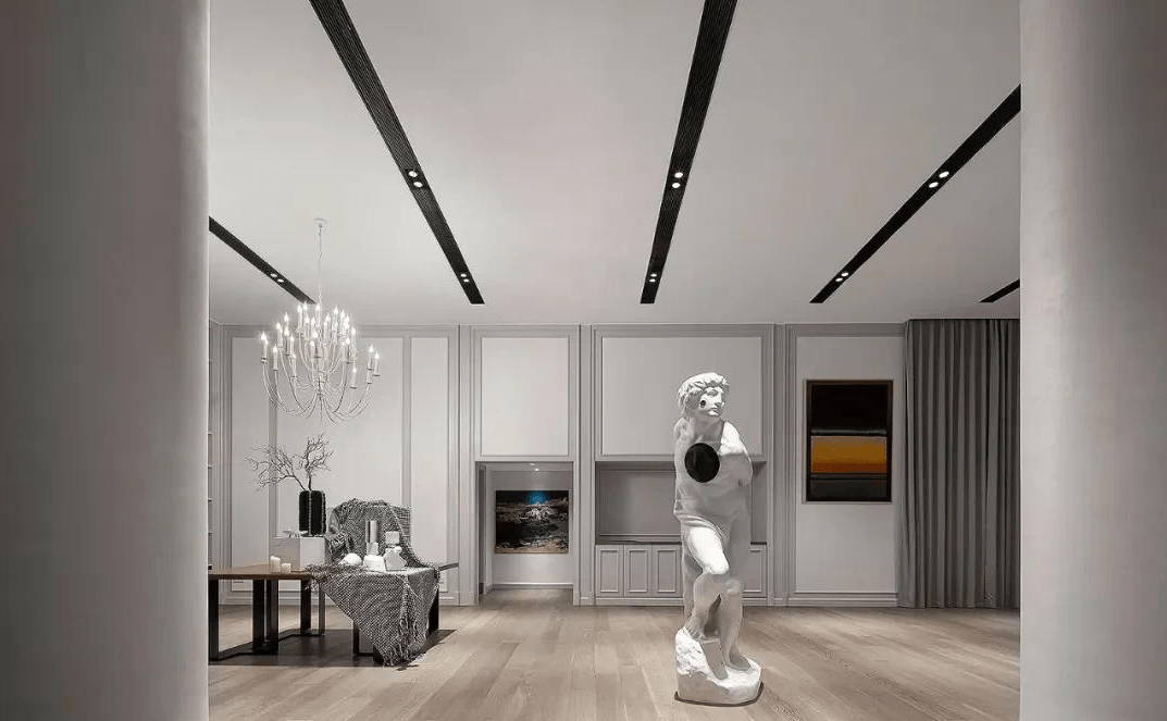 楼梯间的吊灯若隐若现,如星河散落人间,美好而纯粹。造型感十足的楼梯间本就如同一件艺术品,再相伴挂画、雕塑点缀其中,大美无形的凝聚力就是这个家最好的内在性格。